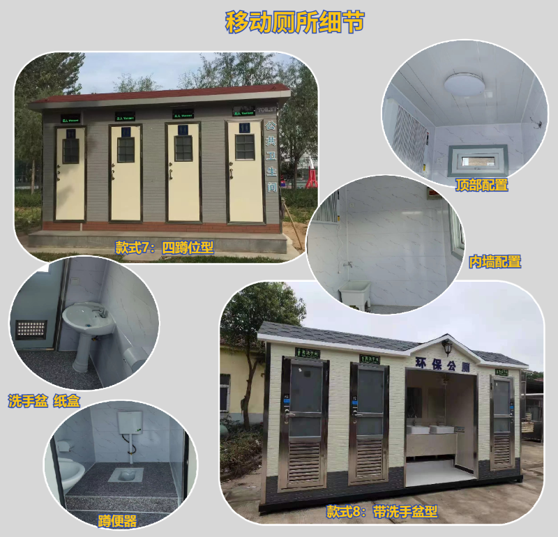 移动公厕与传统土建式厕所相比占地面积少,厕所还有抗震能力和防止疾病传染功效,该款产品经久耐用,高档时尚、物美价廉,是一款公共场所不可缺少的设施。